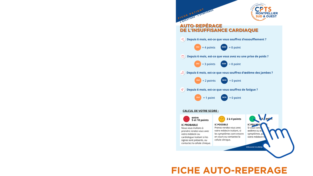 - Auto ou hétérorepérage, basé sur les signes d’alerte EPOF (Essoufflement, Prise de poids, Oedèmes, Fatigue) ;